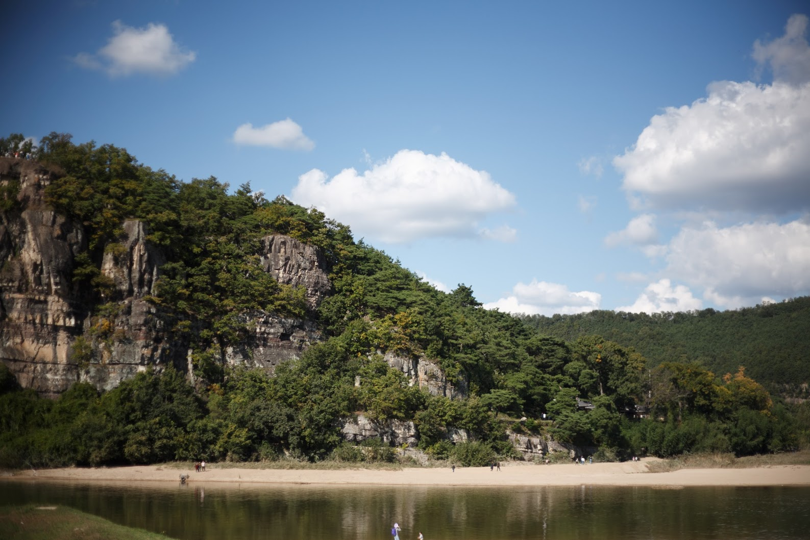 주창에서 차를 세우고 입장권을 구입하고 셔틀버스를 갈아타고 입구에서 내리기를. 마치 유명 놀이동산에 가는 순서다. 여기 또한 황금 늘녘이다. 입구에서 왼편 둑방길로 접어들었다. 오른쪽으로 강이 흐르고 왼편으로는 마을이 보인다. 멀리 배로 사람을 실어 나르는 모습이 보이는데 우리는 그냥 계속 걸었다. 조금 걸으니 솔숲이 보인다. 강변에 조성된 오래된 소나무 숲이라서 바닷가 소나무숲에서 느껴지던 그런 느낌이 들면서 쉬고 가고 싶다. 멋진 소나무숲이다.